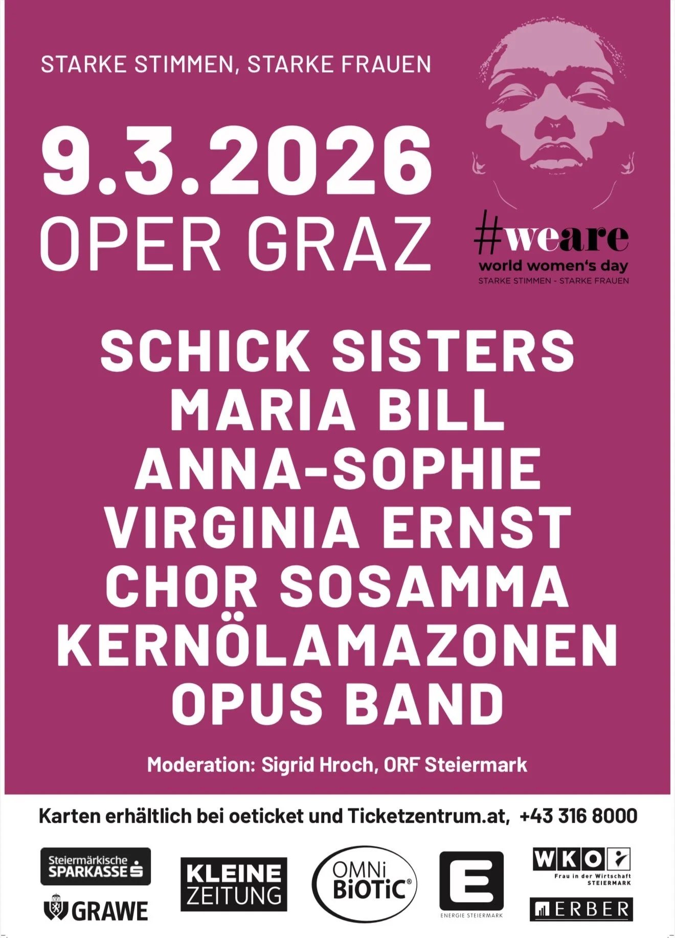 Auch heuer laden die Schick Sisters wieder viele tolle Künstlerinnen auf die Bühne der Oper Graz. Die Initiative #weare Starke Stimmen, starke Frauen, die von Virginia Ernst ins Leben gerufen wurde, geht 2026 in die nächste Runde!